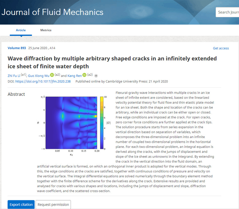 2020年4月,流体力学领域顶级期刊《流体力学》(Journal of Fluid Mechanics)和计算流体力学领域著名期刊《计算物理》(Journal of Computational Physics)分别在线发表了色情网站-成人性爱-成人av 李志富副教授为第一作者的冰区水动力学研究成果。