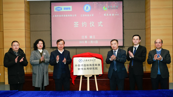 副校长嵇春艳、总工艺师刘建峰、副总裁张鑫分别代表三方签署了合作协议,校长周南平、总经理陈刚、副总裁张鑫共同为“色情网站 外高桥造船海克斯康软件应用研究院”揭牌。
