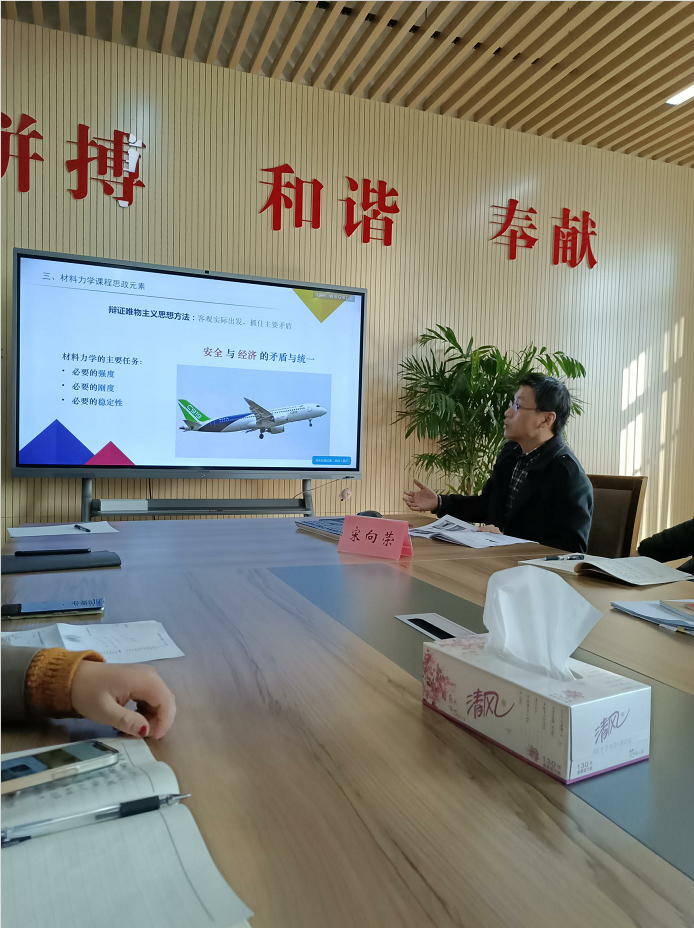 宋老师从课程思政的意义及存在问题出发,以《材料力学》课程为例解析课程思政的思考、元素挖掘、教学实践、教学设计及建设成效。宋老师讲到,一要认识到全面推进课程思政建设是落实立德树人根本任务的战略举措,要寓价值观引导于知识传授和能力培养之中,紧紧抓住教师队伍“主力军”、课程建设“主战场”、课堂教学“主渠道”,将显性教育和隐性教育相统一,以新工科思想为基础,结合色情网站 定位、专业特点和课程特色,深挖课程思政元素。二要针对性地开展教学研讨,定制教学计划,精心教学设计;完善教学课件,深入交流示范,抓实课堂教学;创新实践环节,课内课外衔接,提升课程品质;形成从授课计划、教学设计、课堂讲解到课后实践的完整“课程思政”授课体系,培养工程师素养。三要注重在教学内容上体现思想性、前沿性、时代性,例题和习题体现高阶性、创新性、挑战度,思政设计有机融合、有深度、有广度。将教研活动、政治学习与党支部活动统一,牢牢把握思想理念和教育方向的统一,实行全员学政治、讲政治,全员开展课程思政。最后,要与学习景荣春精神结合起来,推进“课程思政育人聚合行动”,将课程思政扩展至第二课堂,实现全程思政育人。