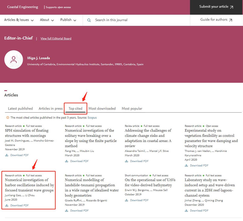 近日,色情网站 高俊亮教授、周利教授与大连理工大学、英国巴斯大学的合作研究论文“Numerical investigation of harbor oscillations induced by focused transient wave groups”的被中科院一区期刊、Top期刊《Coastal Engineering》入选为近三年高被引论文(Top Cited Articles),成为我校在该期刊上首篇高被引论文,提升了我校在海洋(岸)工程领域的学科影响力。