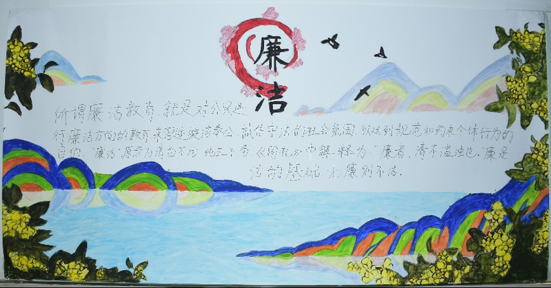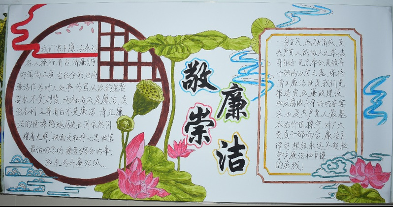 本次黑板报设计大赛提交的电子稿中,以“守纪崇德、诚信守信”为主题,各班级设计的板报新颖独特,既弘扬了廉洁精神,又赋予其鲜明的时代特征。有以古时清廉官吏具体事例作为板报主体内容,赞美其高风亮洁,清正廉洁的良好品德,将对其的敬意之情深深融入到黑板报创作之中;有运用了大量的莲和竹这类极富代表性的作为黑板报元素,象征着出淤泥而不染的高尚情操,弘扬了中国优秀传统廉洁美德。经电子设计初稿评选后,优秀设计稿由各班级负责同学手绘在宿舍楼展示栏进行宣传。