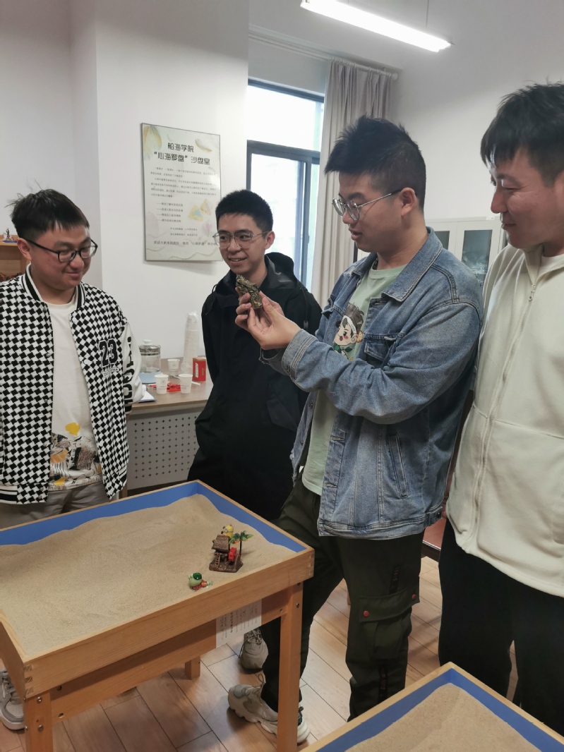 活动中,王老师为大家带来了干货满满的心理健康知识,并在授课过程中对心理沙盘游戏进行了普及和讲解。随后,同学们在老师带领下,进入沙盘的世界,老师指导志愿者从架子上挑选沙具放进沙箱以装扮自己的沙滩,并结合心理学中本我、超我和自我理论及心理投射原理,对其布置好的沙盘进行专业化的解读,通过沙盘游戏的模拟和原型物的象征意义探求潜意识深处的自我期待和情感缺失,剖析志愿者的内在欲望和情绪宣泄方式。沙盘世界就像一座“心灵花园”,使内心世界和外在生活得到逐步呈现和自我揭示。在老师生动形象的讲解和分析下,大家不仅对沙盘疗法有了基本的认识和理解,还在寓教于乐中缓解了工作压力,丰富了内心世界,一时间,沙盘室里充满了欢声笑语。