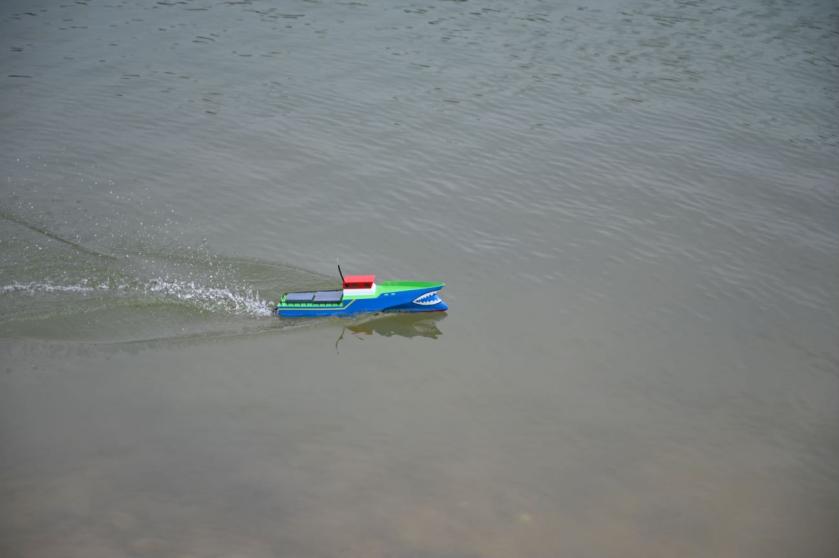 竞速类船模比赛环节,组委会给定船型尺寸但不限定船型,给予各参赛队伍充分的自主设计空间,在评委老师对各参赛队伍的模型进行检查和初步打分后,各船模统一在文理大楼南广场前的湖内赛道进行了竞速比赛。比赛现场氛围激昂,竞争激烈,波光粼粼的水面上一艘艘模型飞驰,同学们精细的模型设计和恰当的动力系统布置在竞赛中都发挥了重要的作用,各队伍都取得了不错的成绩,专业知识和动手能力得到充分锻炼。