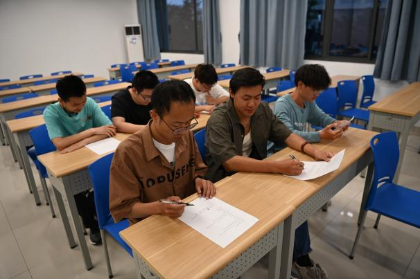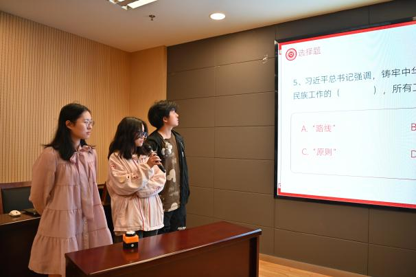 在决赛中,每组完成6道简答题后,主持人随机抽取六道题目,每位队员选择两道题目作答,抢答氛围紧张激烈,选手们都打起十二分的精神,聚精会神地盯着屏幕,以从容不迫的态度回答一个个问题,展现他们对中华民族共同体意识的掌握程度之高,两组选手在抢答环节中都展露锋芒,让决赛迸发出知识的火花。