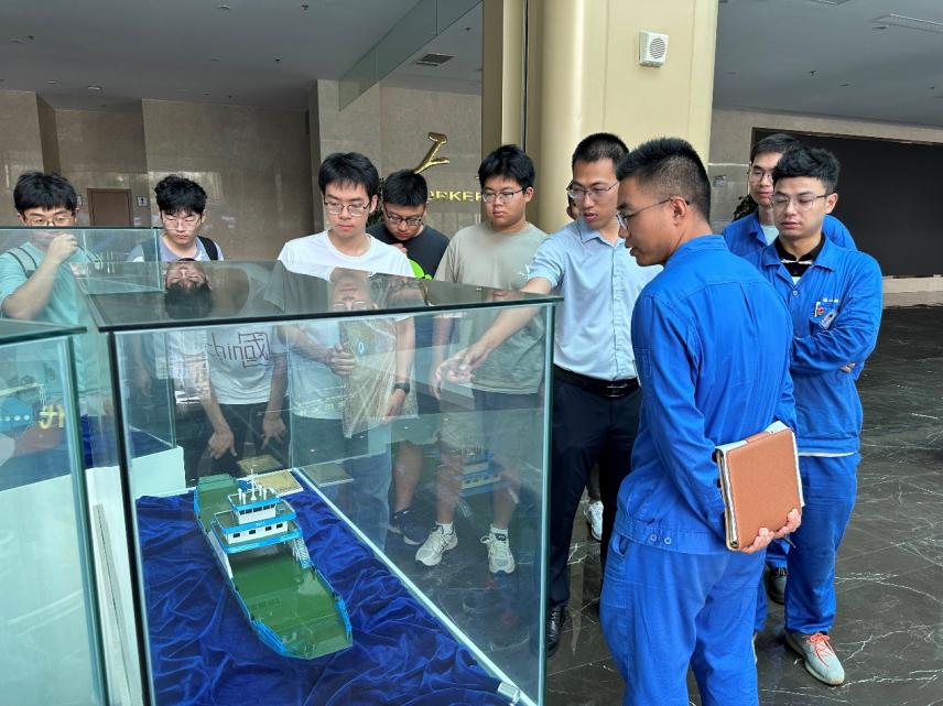 镇江船厂团委书记倪鑫为实践团成员介绍了镇船的发展历程和典型事记,他指出,镇船多年以来一直深耕拖船领域,产品从内河走向海洋,厂址从北固山甘露寺下迁入扬子江润养大桥之畔,目前已发展成为一个以设计建造特种船舶为市场形象的现代造船企业。随后,实践团成员参观了镇船的各类典型产品模型,其中最具有代表性的是多功能全回转拖船,该型船舶是镇船的“拳头”产品,从1986年开发至今已建造600余艘,除用于港口作业外,可兼作消防、破冰、环保、巡逻、引航等作用,被工信部授予中国“制造业单项冠军产品”。
