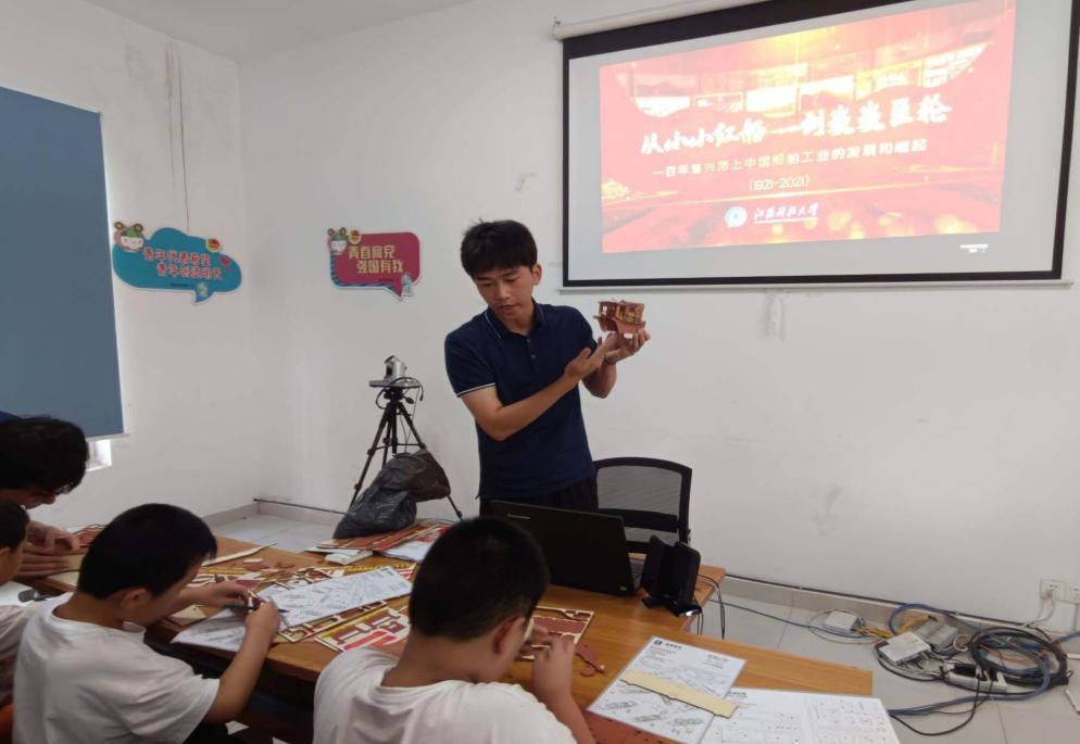 实践团成员来到了根思乡新时代文明实践所暑托班,小小红船承载千钧重任,开启了中国共产党的跨世纪航程。实践团成员先带领暑托班的少年儿童们了解红船党史故事,回顾革命先烈开天辟地、敢为人先的首创精神,并通过观看红船历史,了解中国共产党的起源,坚定理想信念,传承“红船精神”。随后实践团成员带领根思乡新时代文明实践所暑托班小朋友们制作红船模型。“船模不是玩具,而是历史、是文化。”少先队员们通过制作红船模型,重温党的历史,体验革命情怀,传承红色基因。尽管船模制作有一定难度,但是大家仔细研究,互相启发,最后一艘艘精巧美观,栩栩如生的红船诞生了,小朋友们脸上演绎着成功的喜悦。