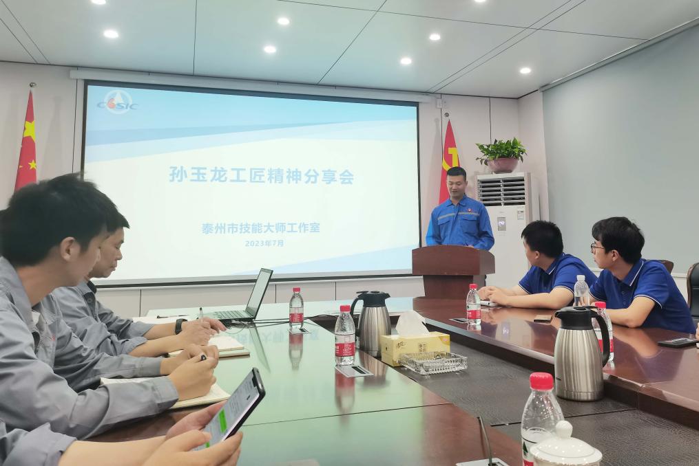 随后,实践团全体成员学习了“江苏省五一创新能手”、“江苏省技术能手”、“江苏省企业首席技师”、“江苏省劳动模范”孙玉龙技能大师分享的船舶工匠精神。孙大师用朴实的语言、真挚的情感讲述了他从一线职工到技术骨干的奋斗历程,向大家诠释了新时代劳模精神、船舶工匠精神的深刻内涵,鼓励大家脚踏实地、艰苦奋斗,精益求精,在平凡的岗位上做出不平凡的业绩。实践团成员均纷纷表示他们将进一步以榜样为引领,求得真学问、练就真本事,让青春在全面建设社会主义现代化国家的火热实践中绽放绚丽之花。
