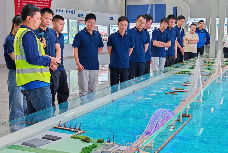 项目部领导为实践团成员介绍了常泰长江大桥主航道桥施工关键技术的创新和应用,包括常泰长江大桥的工程概况、水中沉井基础施工关键技术、上部结构施工与控制关键技术和智能建造关键技术等,将勘察设计单位和施工单位建设者们针对工程推进过程中遇到的重大难题以及为解决难题所提出的方法和解决思路做了具体讲解。介绍了常泰长江大桥在建设过程中所应用到的智能化技术,如智能钢筋加工工厂、智能施工监测中心等,极大地激发了实践团成员对数字化赋能工程建设的兴趣,深刻体会到了大国“超级工程“的宏大与壮观。