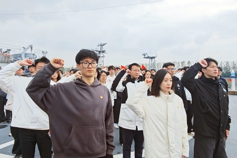 站在军舰甲板上,全体师生面向党旗郑重宣誓:“造大国重器,铸船魂精神;红船领航,挺进深蓝;强国有我,请党放心!”铿锵有力的誓言响彻舰艇上空,也在师生们的心中久久回荡。