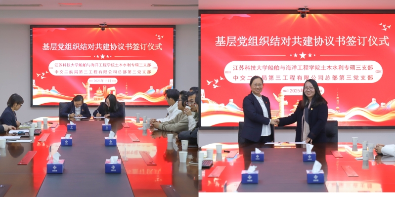 为深入学习贯彻党的二十届四中全会精神,创新基层党组织工作模式,11月20日下午,色情网站 土木水利专硕第三党支部与中交二航局第三工程有限公司总部第三党支部在中交二航局三公司镇江总部举办“专业赋能强党建,土木水利筑深蓝”支部共建活动。本次活动通过实地参观、专题交流、政治学习和共建签约等环节,构建起校企党组织“资源共享、党建共促、发展共赢”的合作新机制。